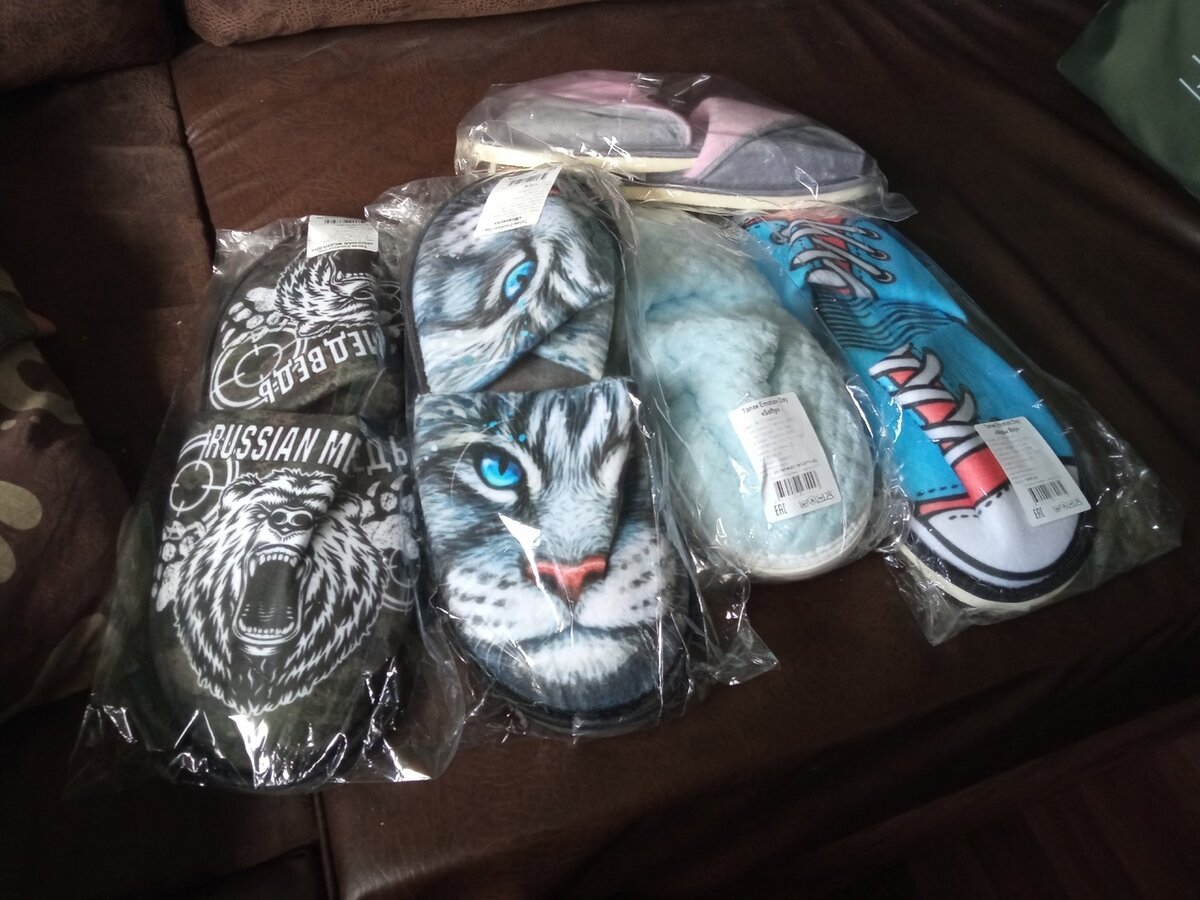 Она мне привезла в подарок кучу оригинальных тапочек для всей семьи, это изделия предприятия, где она работает.