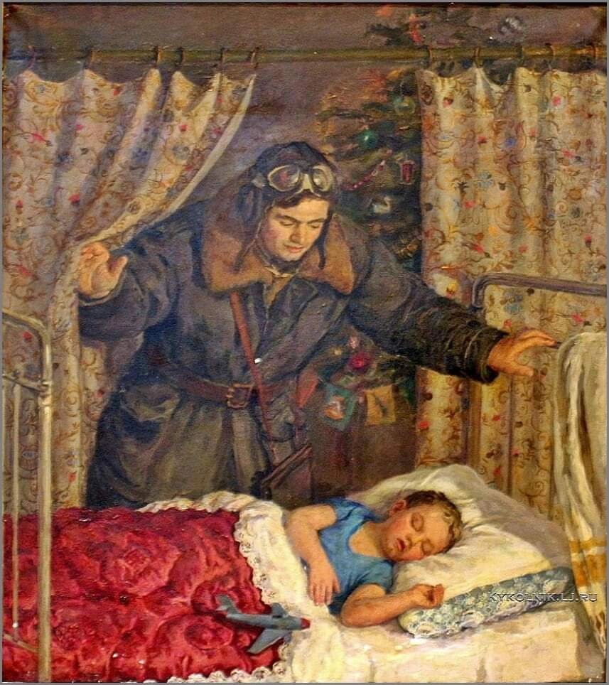 В небе бескрайнем летит самолёт, В белых горах расцветают тюльпаны. В южном посёлке мальчишка живёт – Маленький юнга с душой капитана. С папиных плеч открывается мир: Первые радости, Первые слёзы. «Ну-ка, сынок, без меня доплыви! Всё поначалу бывает непросто. Ветры, течения – только держись! Встречи, сомненья, удачи, тревоги… Если не справишься, то обернись! Я буду рядом с тобою в дороге. Путь укажу и с бедой разберусь. Только услышь меня, где бы ты ни был! Я твой отец. Я люблю и горжусь. В десять и в семьдесят. Здесь И на небе». В качестве иллюстрации использована картина: «Возвращение из ночного полёта» 1955 Переяславец Владимир Иванович