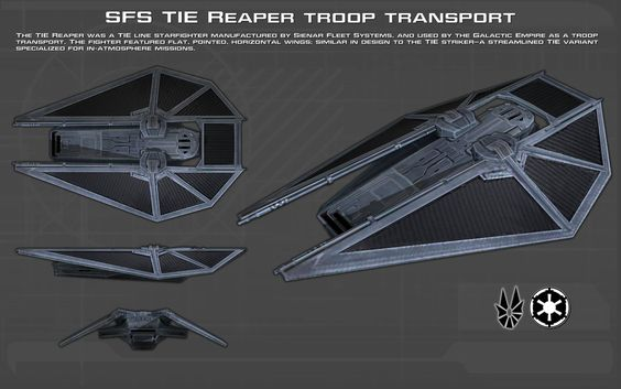 TIE/RP Reaper – это одна из множества моделей кораблей TIE из вселенной "Звездных войн". В этой статье мы рассмотрим историю создания, применение, а также технические характеристики TIE/RP Reaper, который служил в Имперской флоте. Штурмовой десантный корабль TIE/rp «Жнец»[7] был моделью войсковогой транспорта серии TIE,[2] которую производила компания «Флотские системы Сиенара».[1] Транспорты имели плоские, заострённые, горизонтальные крылья[2] и внешне напоминали TIE «Ударный» — модернизированный вариант TIE истребителя, специализированный для ведения боя в атмосфере. Стоимость 140 000 кредитов.