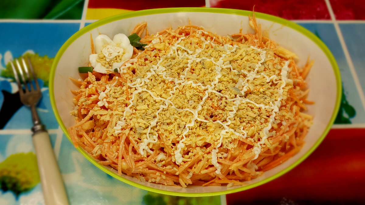 Уважаемые подписчики и гости моего канала, рада приветствовать вас! Сегодня готовим простой и экономный салатик на любой случай. Салат этот всесезонный, бюджетный на скорую руку с морковкой, сыром и чесноком. Все ингредиенты отлично сочетаются между собой, образуя прекрасное вкусное блюдо. На вид салат получается очень красочный и яркий. Время приготовления 15 минут. Ингредиенты: 1. Морковь сырая- 2 шт. 2. Яйцо варёное- 3 шт. 3. Чеснок- 3-4 зуб. 4. Сыр- 150 гр. 5. Майонез- 3 ст.л. 6. Соль- 1/2 ч.л.(по вкусу) Пошаговое приготовление ⬇️ Морковь моем, чистим, сушим бумажным полотенцем и натираем на тёрке для корейской моркови. (При желании можно натереть на обычной крупной тёрке.) Измельчаем чеснок. Затем натираем на крупной тёрке сыр. Варёные яйца разделяем - желтки отдельно от белков. И натираем белки на крупной тёрке, желтки на мелкой. Далее перекладываем в глубокую миску все подготовленные для салата продукты: морковь, сыр, чеснок и яичные белки. Солим по вкусу. Заправляем майо