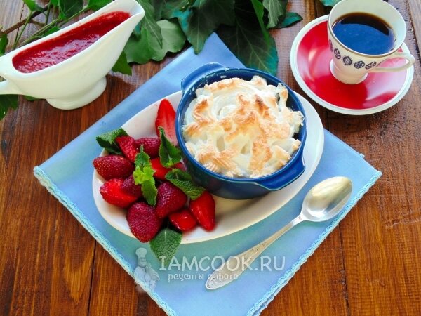 Ингредиенты Яичный белок - 2 шт. Сахар - по вкусу Клубничный джем или соус - 2 ст.л. Свежие ягоды (клубника) - по вкусу Процесс приготовления Хочу поделиться с вами рецептом простого в приготовлении, лёгкого и очень аппетитного десерта - клубничного суфле, которое готовится буквально за 5 минут. Приготовление такого десерта потребует от вас минимум усилий. В качестве основы используется любой ягодный или фруктовый джем либо домашний ягодный соус, верхушка – воздушная шапочка из взбитых белков, которая слегка подрумянивается в духовке до золотистого цвета. В итоге, всего за несколько минут, у вас на столе - нежнейший, воздушный, лёгкий и безумно аппетитный десерт – белковая шапочка, чуть тронутая золотистыми бликами, чуть более плотная снаружи, внутри немного тягучая и очень воздушная, в сочетании с ароматным кисло-сладким ягодным сиропом. Их сочетание создаёт приятный контраст и придаёт волнительную глубину вкусовым ощущениям. Такой десерт можно приготовить за несколько минут, если вне