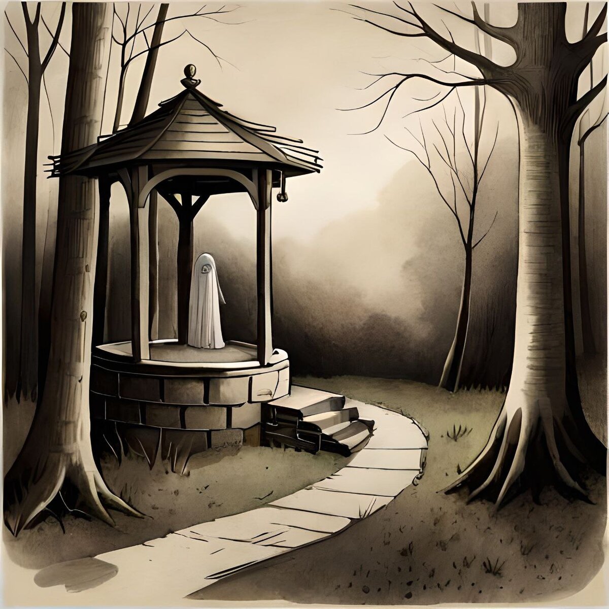 Однажды в маленькой деревне, на окраине леса, произошло нечто ужасное. Жил в той деревне мальчик, по имени Савелий. Ему было всего 7 лет, но рос он необычайно любопытным ребенком. От старших детей он часто слышал страшные истории о призраках и злых духах, живущих в старом колодце в чаще леса. Но Сава не верил в эти истории и решил доказать, что призраков на самом деле не бывает. Одним жарким летним днем, мальчик отправился к колодцу один. Он взял с собой кастрюлю чтобы набрать воды и доказать всем, что местные легенды – всего лишь вымысел. Когда он подошел к колодцу, то увидел, что вода в нем была удивительно чистой и холодной. Савелий начал набирать воду, когда вдруг почувствовал холодный поток воздуха и услышал слабый шепот, словно кто-то говорил ему на ухо: - Смотри-и-и-и, мальчик! Сава обернулся, но никого рядом не было. В следующую секунду вода стала черной как ночь, и кастрюля разлетелась вдребезги. Савелий испуганно закричал и бросился бежать, но ноги словно прилипли к месту.