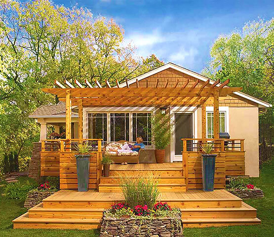 Перголы могут быть использованы не только на даче, но также и на участке вокруг дома. Они могут быть построены как на открытых площадках, так и на веранде или крыльце.