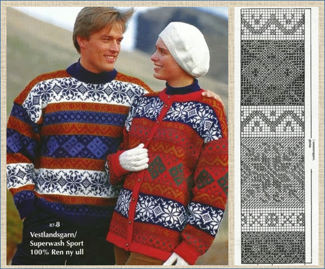 Встретила в сети вот такой эффектный дуэт из мужского джемпера и женской кофточки. На них одинаковый жаккардовый рисунок, выполненный в разных цветах, хотя и в одинаковой цветовой гамме.
