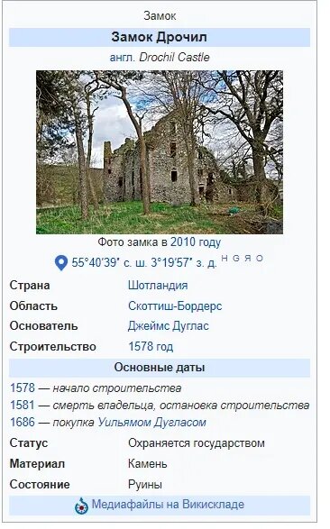 Замок на северо-западе области Скоттиш-Бордерс, Шотландия. Руины замка расположены в небольшой роще на автодороге B7509 примерно в 150 метрах от реки Лин-Уотер. Ближайшие населённые пункты: деревни Блит-Бридж, Романнобридж, Холлин, Стобо. Дро́чил (Drochil Castle) — за́мок на северо-западе области Скоттиш-Бордерс, Шотландия. Строительство замка в 1578 году начал граф Джеймс Дуглас, регент Шотландии, однако три года спустя он был казнён, к тому времени замок был выстроен едва наполовину. Более достройкой сооружения никто не занимался, и замок вот уже почти четыре с половиной века так и остаётся недостроенным. В 1630 году замок был окончательно покинут. В 1686 году недостроенный замок приобрёл герцог Уильям Дуглас, и до настоящего времени им владеют его наследники из рода Баклю.