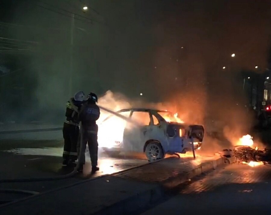Мотоцикл врезался в припаркованный автомобиль и загорелся. Пострадавшего байкера увезла скорая. Вскоре полиция сообщила, что он скончался.