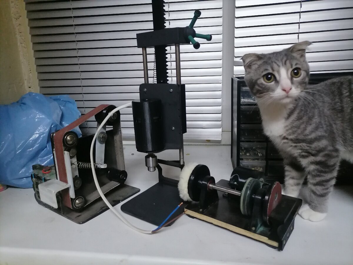 Приветствую всех. Очередной станочек для домашнего хобби готов. История этого станка была начата ещё более 5 лет назад, но в то время в виду отсутствия деталей для сборки которые я себе представлял в голове пришлось забросить станок на не определённое время. Сейчас же всё чаще стала быть необходимой сверловка по строгой вертикали, фрезеровка выемок и отверстий, чего добиться порой шуруповёртом сложно. Станина у станка с направляющими из нержавейки, направляющие втулки интегрированы в переходной кронштейн, способ более чем рабочий, на таком же принципе у меня завтулен 3д принтер и работает годами, ну или иначе инвертируя, втулки из петГ переваривают более 30катушек пластика, в сравнении с заводскими линейными шариковыми подшипниками где пробег кардинально разы меньше а потом грозит замена комплектом подшипника с направляющими. Ну кто юзал дрыгостолы анет и подобные, тот знает) Двигатель был отжат у шуруповёрта, если не ошибаюсь. Переходная цанга и патрончик были приобретены на алишке,