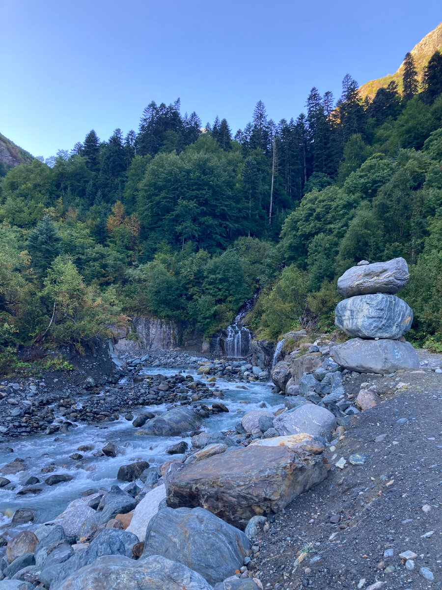 6 утра - подъем, ранний отход ко сну помог проснуться отдохнувшими. В 8.30 дошли до КПП и были первыми посетителями. Заплатили по 200₽ с каждого, заполнили бумаги и ушли в Аманауз. Так называется ущелье с тремя водопадами. Первый- Чертова Мельница. Близко к краю лучше не подходить-опасно. Водный поток мощный, виды красивые, но на отдых останавливаться рано. Куда дальше идти не понятно, т.к. огромные булыжники и табличка рядом «Проход запрещен» вводят в заблуждение. Обошли валуны, тропа есть, двигаемся по ней. Снова путеводитель почуял опасность и скомандовал «Назад». Вернувшись к валунам встретили первого человека на маршруте и как здорово, что он здесь не первый раз. Виталий стал нашим проводником на Суфруджинские водопады. У первого водопада мы свернули не туда и оказались в малиннике полном спелых ягод. Сам водопад не так впечатлил, как второй, где мощный поток воды создает водяную пыль на несколько метров вокруг. Полюбовались и тронулись в обратный путь. На малиннике устро