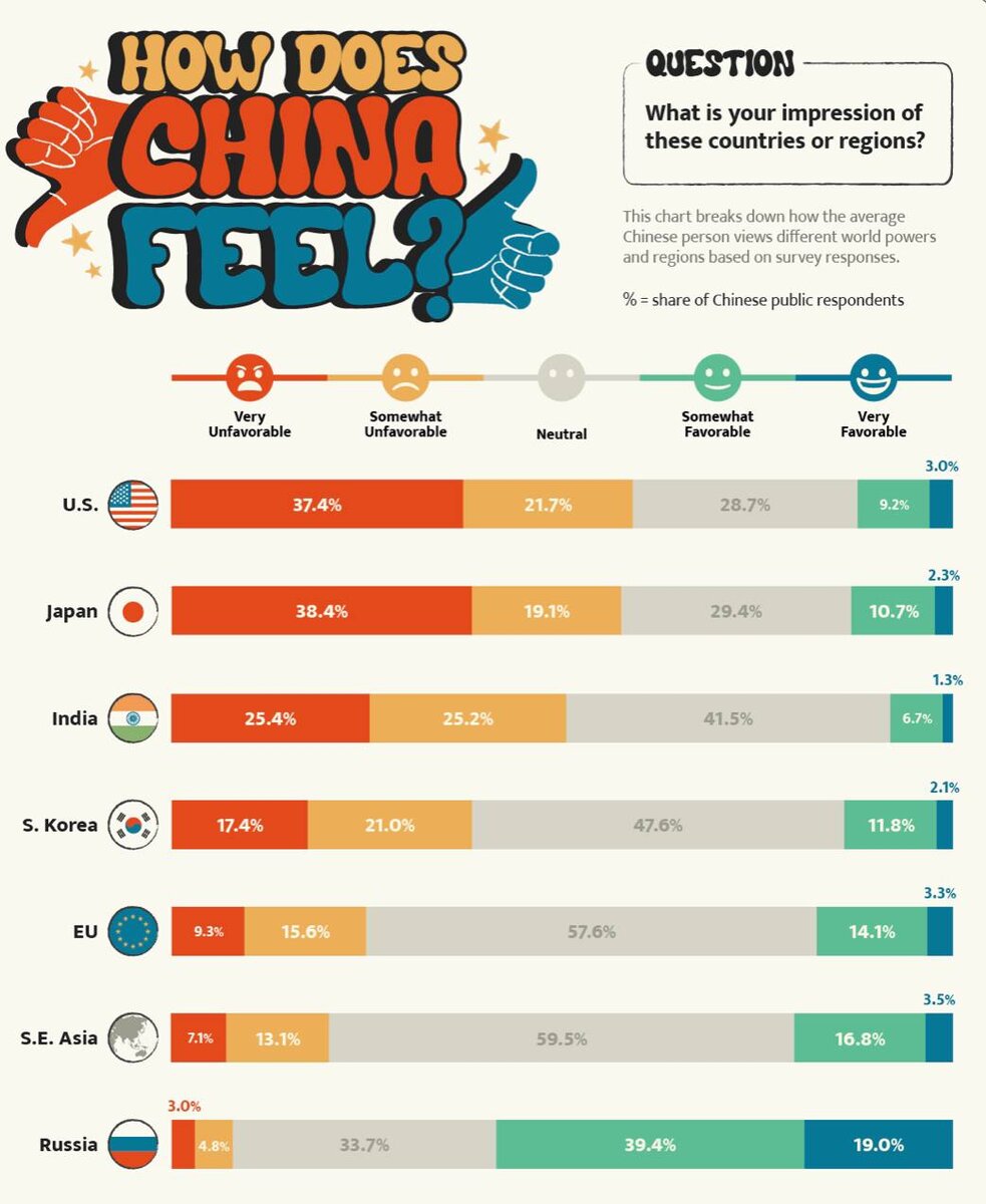 Как жители Китая относятся к представителям разных стран? 🟠🟡Оранжевый и желтый цвета - неприязнь; 🔘Серый цвет - нейтральное отношение; 🟢🔵Зеленый и синий - теплое и позитивное отношение. Картинка говорит сама за себя: почти 60 процентов китайцев лучше всего относятся к россиянам, а хуже всего – к американцам. Также сильно не любят жителей Индии и Японии.