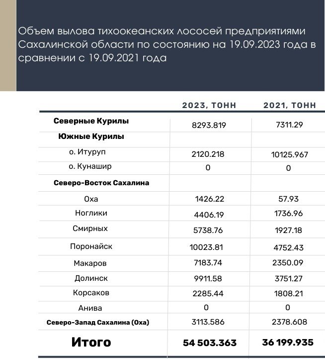На 19 сентября 2023 года вылов тихоокеанских лососей предприятий Сахалинской области составил 54 503.363 тн. В том числе горбуши 34 707.166 тн., кеты 17 641.569 тн., нерки 1 347,634 тн., кижуча 806,994 тн.