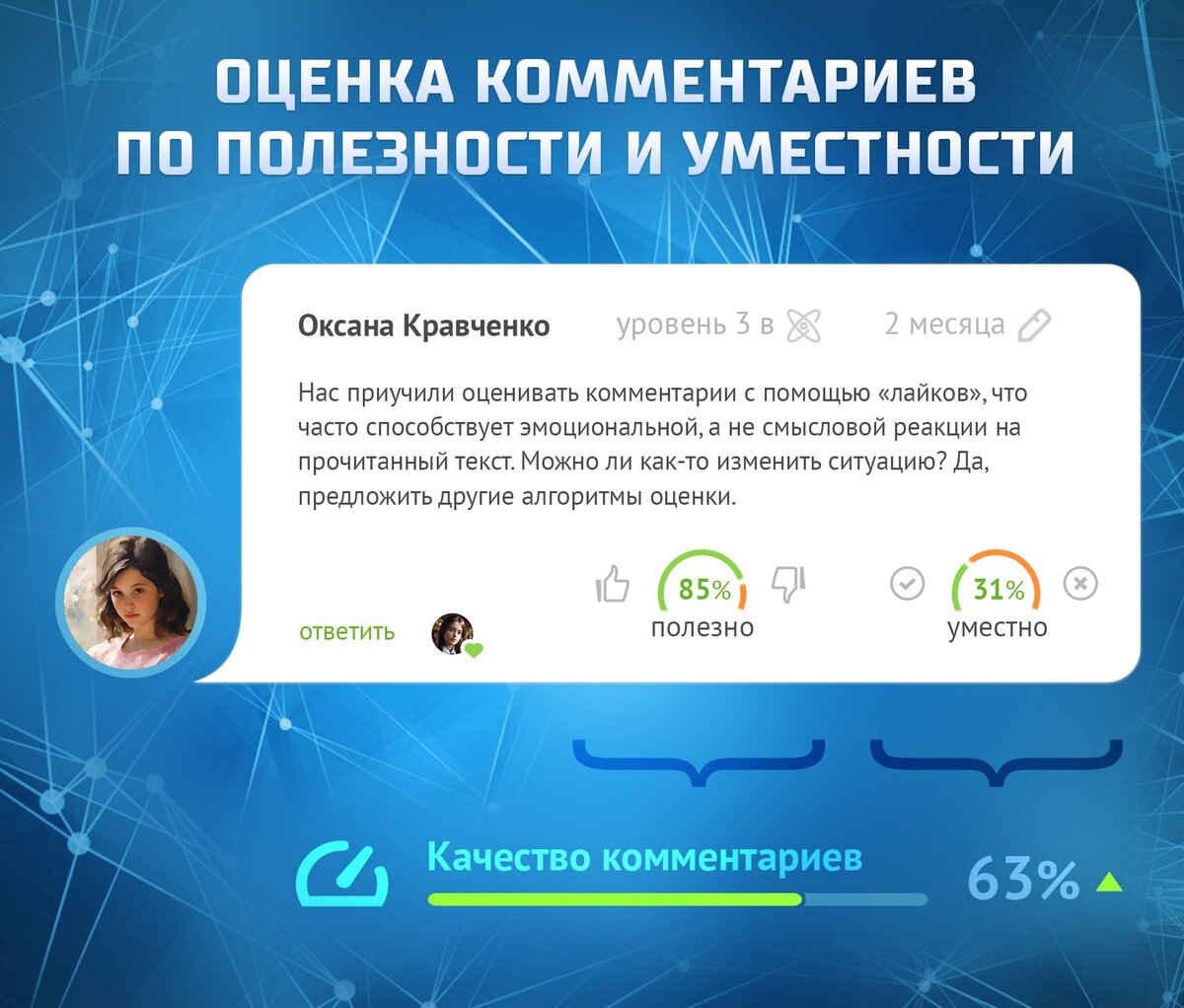 Благодаря оценке по полезности наверх по результатам голосования и сортировки будут подыматься более содержательные комментарии, а не просто эмоциональные отклики на прочитанное или просмотренное. Это значительно повысит качество обсуждения.