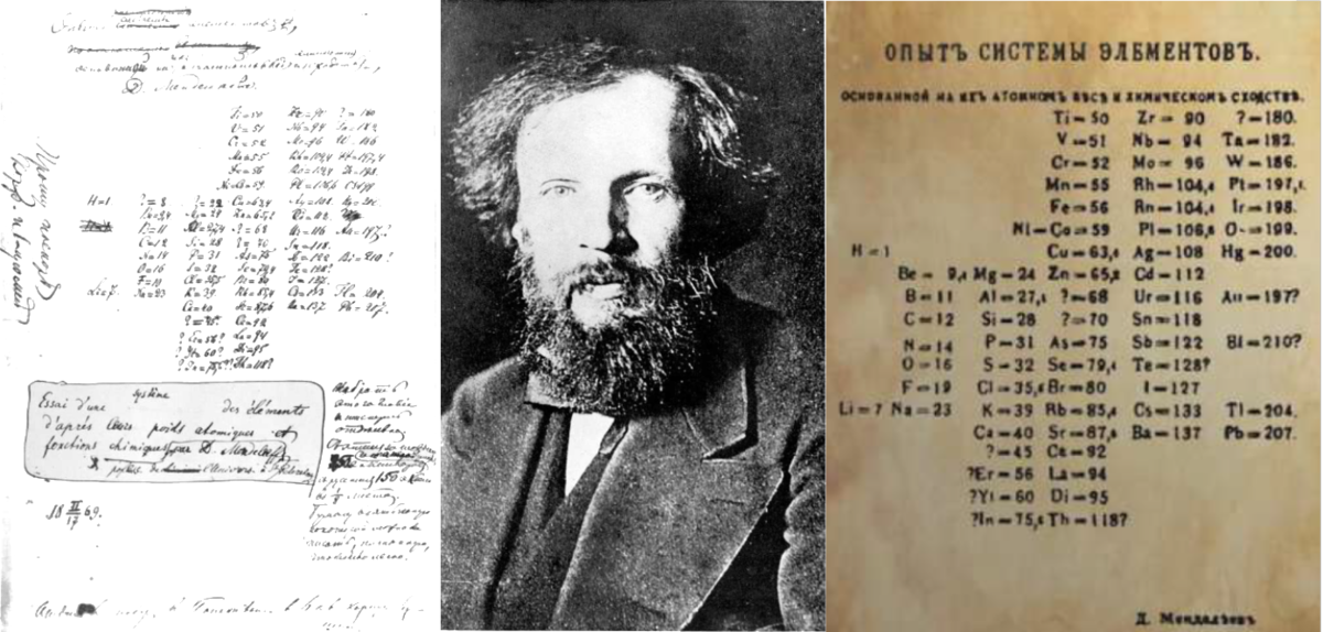Менделеев сформулировал идею о том, что свойства различных химических элементов повторяются через определенные периоды в феврале 1869 года. Через месяц в Русском химическом обществе был сделан доклад о зависимости свойств от атомных масс элементов, содержащий следующие основные положения: