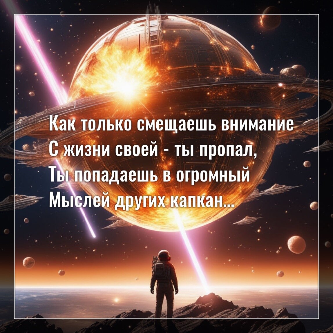 Как только смещаешь внимание С жизни своей - ты пропал, Ты попадаешь в огромный Мыслей других капкан, Не ощущаешь свой стержень, Дорога внизу не твоя, Ты даже не видишь солнца И плачет Душа твоя. А ты даже не понимаешь, Что от себя ушёл, Как возвращаться не знаешь, Смотришь на небо в упор И ждешь прямого ответа, Зачем ещё здесь живёшь? Себя потерявший однажды, Вокруг себя строит ложь. Маски всегда надевает, В иллюзиях вечно живёт, Он бы хотел спастись, Но не видит дороги вперёд, И тогда Бог заводит тихонько Души такие в тупик, Где нет никого кроме них, Они слушают свой крик, Они чувствует сердца биения, Тело своё ощущают, Наедине с собой Про маски все забывают, Рождаются просто заново, Других вариантов нет, Выйдя из тупика, Не давая знакомым ответ, Меняют своё окружение, Потому что вернулись к себе, Поняли, нет важнее Их Души на этой Земле, Нет важнее её развития, К Душе своей прикосновения, Больше уже не важно Чьё-то «открытое» мнение, Больше уже не важна Подача, «любовь» извне, Ты б