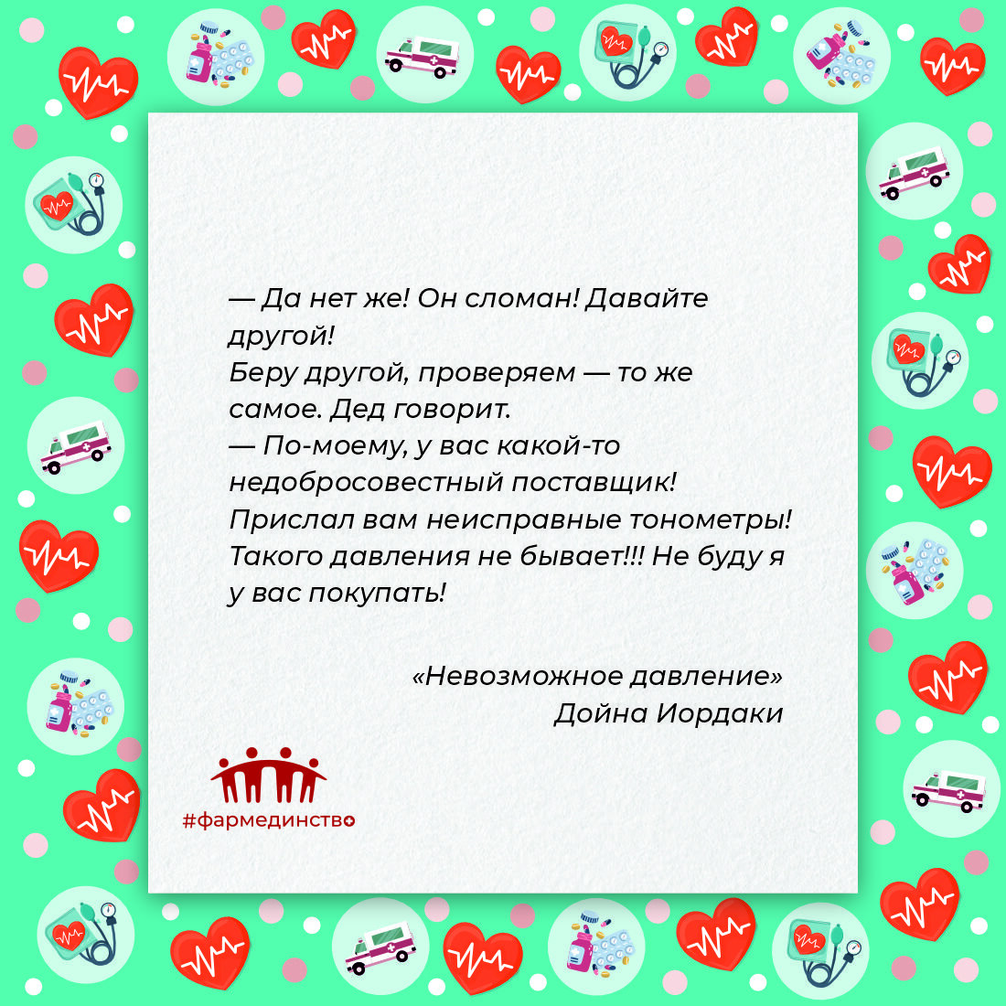 Дойна Иордаки Невозможное давление Смешных историй набралось немало. Но одна история осталась со мной навсегда. Было это ещё в начале моей карьеры. А начинала я работать в аптеке с одной кассой. Поначалу было очень страшно потому, что если что-то не можешь найти или не получается ленту сменить в кассе — помочь тебе некому! У нас в аптеке, кроме ЛП и БАДов, был прекрасный ассортимент медтехники. Сколько всяких тонометров, глюкометров, ингаляторов и прочего. Под конец дня приходит дедушка и говорит: — Мне нужен тонометр-автомат. Чтобы я ничего не делал, а он мне давление измерял! — У нас есть автоматические тонометры. Но вам необходимо будет самому надеть манжету и нажать на кнопочку. — Нет, не такой! Я по телевизору видел — есть такие, что сами все делают и даже говорят время и погоду! — У нас таких нет, к сожалению. — Ну вот, так и знал! Давайте мне самый хороший из тех, что есть! В итоге выбрали мы тонометр. Конечно же, его необходимо было проверить. У нас такая установка, что проверя
