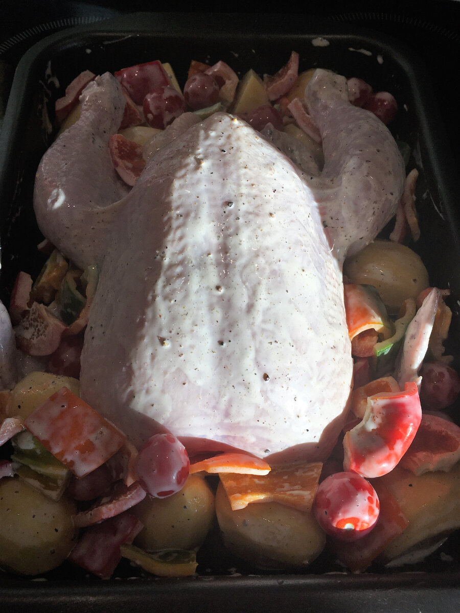 Сегодня я хочу поделиться со своими читателями уникальным рецептом, который точно покорит сердце и желудок каждого. Захватывает дух только от мысли о нежном курином мясе в сочетании с ароматным картофелем и сочными помидоркамичерри и сладким перцем. Готовы начать? Тогда вперед к кулинарным приключениям! Нам понадобится: одна небольшая курица картофель помидорки черри сладкий перчик соль черный перец майонез приправа универвальная Что и как делаю: Тушку курицы мою, обрезаю лишний жир, кожу и все что не нравится. Затем натираю курицу смесью майонеза, черного перца и соли, плюсом додавляю всякие приправки. Оставляю на полчасика для маринада. Далее картофель, лучше взять срезнего размера, очищаю от кажуры. Если крупный, то лучше размерать. И также перемешиваю с майонезом, перцем и солью. Ту же процедуру проделываем с помидорками черри и сладким перчиком (режу его крупными кусками). Далее все укладываю на противень и ставлю в духовку при 200 градусах на час/полтора. Курица с овощами готова