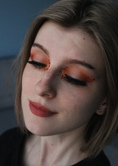 Лондонская неделя моды весна-лето 2023 снова задала тренды на оранжевые макияжи, не знаю, как летом, но сейчас, осенью, думаю, это как никогда актуально. Стала я думать, что же такого мне «сотворить»… Монохром?.. Скучно!.. Стрелки!.. Банально… Стразы?.. Уже интереснее… А что если..... . P. S. Итог моей «дискуссии» вы можете наблюдать ниже: Ну и конечно же инструкция прилагается: Для начала беру яркий оранжево-красный оттенок. И рисую им стрелку. Затем более светлым оттенком Оттушёвываю стрелку вверх, создавая градиент. Смесь из данных оттенков добавляю и во внутренний уголок глаза. А теперь самое интересное… Стразы (клею их на клей для ресниц) Добавляю золотистых хайлайтер. Прокрашиваю ресницы. Объёма мне не хватило, поэтому ещё и накладные наклеила. И Вуа-ля! Образ готов! Список средств, участвующих в создании макияжа: Палетка теней для век Sephora Eyestories Palette Палетка теней из Enchanted Beauty Foxy Neutrals Makeup Set (Too faced) Интересное на Косметисте 👇