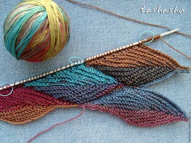 Продолжаю серию своих МК по вязаному пэчворку. Подойдет и секционно окрашенная пряжа, и цветные остатки. Будем вязать полотно из элементов в форме листиков. Вязка чулочная.