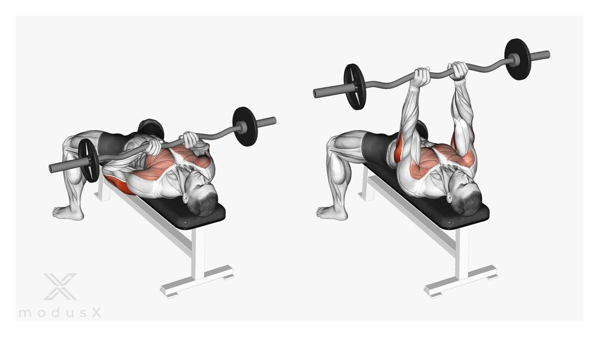 б. Медленно опустите штангу к верхней части груди, затем вернитесь в исходное положение. 2. Французский жим (тяга гантели за голову): а. Лягте на скамью, держа гантели в прямых руках над головой.