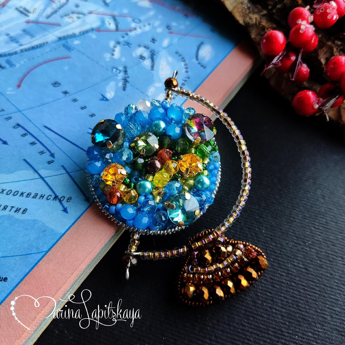 Вечно «белое пятно». К. Ибряев Сегодня делаем брошь в подарок географу) Для изготовления броши понадобятся: ▪️ фетр жесткий толщиной 1 мм, ▪️ акриловые краски, ▪️ бисер чешский № 10 (голубой, желтый зеленый, золотистый), ▪️ канитель жесткая серебристая и коричневая, ▪️ жемчуг 4 мм (голубых, синих, желтых, зеленых оттенков), ▪️ шатоны 5-8 мм (голубых, синих, желтых, зеленых оттенков), ▪️ проволока с памятью 0,5 -0,6 мм, ▪️ рондели 4 мм (голубых, синих, желтых, зеленых оттенков и бронзовые), ▪️ стразовая цепочка 2 мм (коричневая), ▪️ основа для броши - 25 мм, ▪️ нитки капроновые №50, ▪️ клей "Момент-Кристалл", ▪️ картон, ▪️ кожа для изнанки Размер 6 х 4 см Этапы создания Ссылки на материалы:
