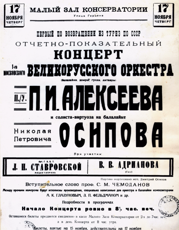 В будущем сезоне Оркестр будет праздновать своё 105-летие. Вот уже более ста лет коллектив радует своих слушателей прекрасной музыкой. За это время у нас было множество знаковых событий, встреч с выдающимися людьми и незабываемые музыкальные моменты. Мы гордимся своей историей и хотим поделиться ею с вами. В новой рубрике «Из архива Оркестра имени Н. П. Осипова» мы будем рассказывать о ярких эпизодах, которые оставили след в истории легендарного коллектива. Вы также узнаете о тех, кто вносил свой вклад в его развитие и успех. Кроме того, здесь вы узнаете о многих выдающихся музыкантах, которые сотрудничали с Оркестром. Мы приготовили для вас уникальные фотографии, аудио и видеозаписи, которые помогут вам окунуться в атмосферу прошлого и почувствовать дух времени. Вы сможете увидеть, как менялся наш коллектив со временем, какие концерты и гастроли были особенно запоминающимися. Надеемся, что наши архивные материалы откроют вам интересные страницы музыкальной истории нашей страны. Мы при