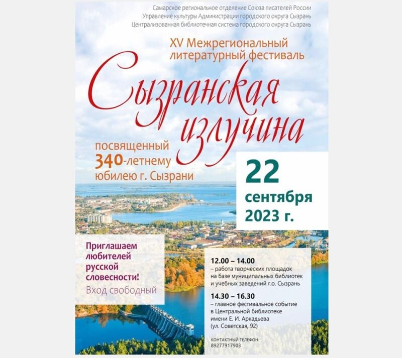 В пятницу, 22 сентября, пройдет фестиваль «Сызранская излучина», посвященный 340-летнему юбилею города Сызрани. В этом году он пройдет 15-й раз. На фестиваль в Сызрань съедутся талантливые писатели из Ямало-Ненецкого округа, Самары, Тольятти, Жигулевска, Усолья. Возглавит делегацию председатель правления Самарской областной писательской организации, секретарь правления Союза писателей России Александр Громов. Фестивальные встречи пройдут одновременно на одиннадцати площадках в учреждениях образования и культуры. Главным фестивальным событием литературного праздника станет встреча писателей с читателями в Центральной городской библиотеке им. Е.И. Аркадьева. Централизованная библиотечная система Сызрани Материал на сайте «маленькая Сызрань»