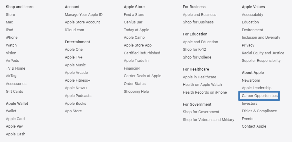 2. ΠΠ°Ρ ΠΎΠ΄ΠΈΡΠ΅ ΡΠ°Π·Π΄Π΅Π» Ρ Π²Π°ΠΊΠ°Π½ΡΠΈΡΠΌΠΈ. ΠΠΎΠ½ΠΊΡΠ΅ΡΠ½ΠΎ Ρ Apple ΠΎΠ½ Π½Π°Π·ΡΠ²Π°Π΅ΡΡΡ Β«Career OpportunitiesΒ». ΠΡΠΊΡΡΠ²Π°Π΅ΡΠ΅ Π΅Π³ΠΎ: