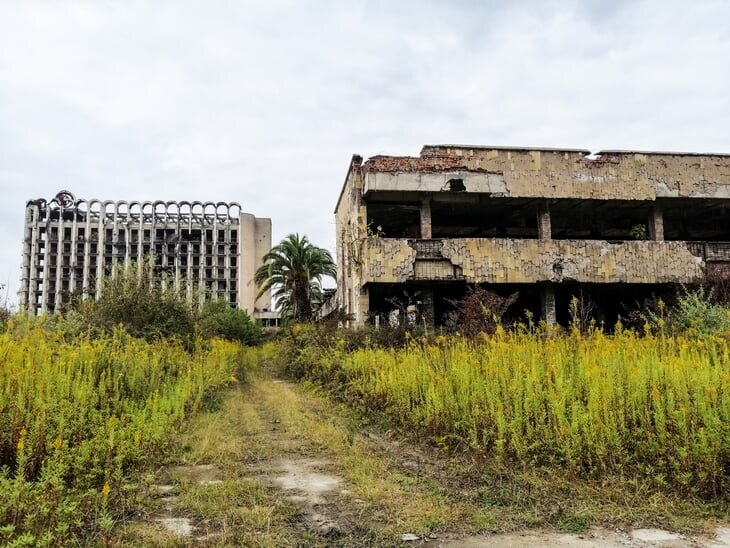 Все это было – и резко исчезло в начале 90-х. Сейчас от легендарной базы остались только руины и воспоминания. В ходе грузино-абхазского конфликта (1992-1993 гг) «Эшеру» изрешетили – неподалеку через реку Гумисту проходила линия фронта. А спортивная база – точнее ее 10-этажная гостиница – использовалась как самая высокая точка боевых действий.