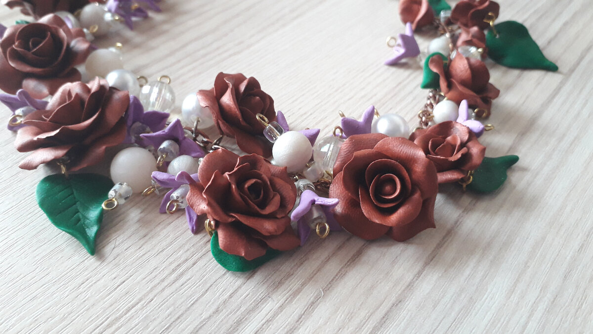 Изготовление украшений своими руками всегда приносит удовольствие и позволяет создавать уникальные аксессуары, которые подчеркнут вашу индивидуальность. Хочу с Вами поделиться как я сделала красивое колье в виде розы из запекаемой полимерной глины. Для создания колье в виде розы Вам понадобятся следующие материалы и инструменты: Запекаемая полимерная глина различных цветов (для лепки розы и листьев). Нож для нарезки глины. Цепочка для основы колье. Колечки и пины для крепления элементов колье. Застежка колье – это небольшой карабин. Начните с выбора цветов глины для лепки розы. Вы можете использовать разные оттенки одного цвета или комбинировать разные цвета по вашему вкусу. Я же выбрала коричневый оттенок роз и назвала свое колье «Розы в шоколаде». Итак, начинаем лепить. Раскатываем тонкие «колбаску» зеленого цвета для листиков розочек, коричневую для лепестков розочек. Еще у меня будут бусины из белой полимерной глины, а также еще фиолетовые мелкие колокольчики. Лепим и всем деталям