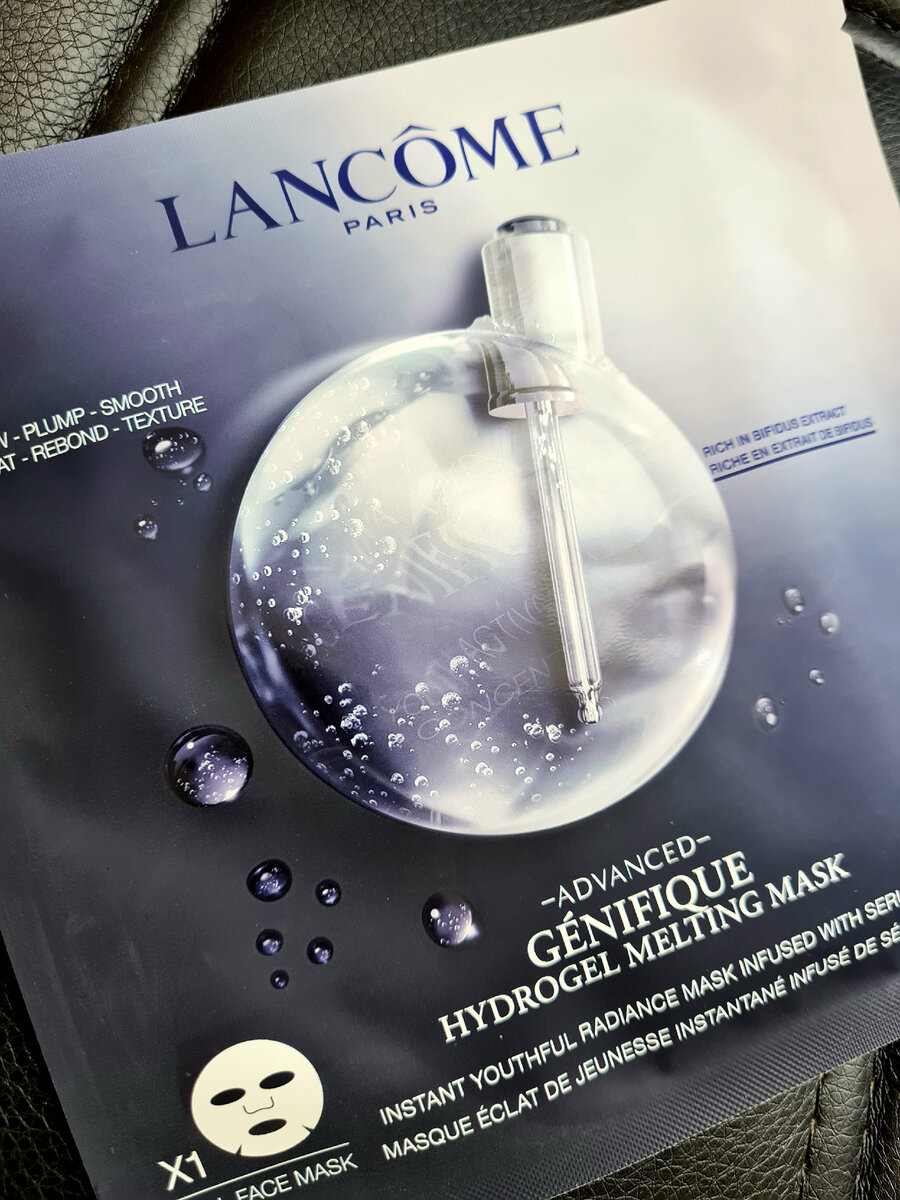 Как же давно хотела ее попробовать! Цена просто космос, убивала покупку маски на корню. 1500р за одноразовую масочку такое себе... Пробовала из этой же линейки маску для глаз - очень понравилась, вот отзыв. Ну и акция случилась в лету, естественно я бегом хватать! Заказала набор - в картонной коробке 4шт - гидрогелевая маска для лица Genefique Advanced LANCOME. Линейка Genefique Advanced знакома многим. У нее нет критериев для определенного типа кожа, подходит всем. Основой действующий ингредиент - пробиотики, которые благотворно влияют на кожаный покров, укрепляют. Кожа вырабатывает естественную защиту, если была этого лишена, повышается тургор и тонус. Маска гидрогелевая, те она как гелевая резинка, очень интересная текстура. Лежит на белой подложке, сверху накрыта еще слоем фольги, чтобы не замялась. Сыворотки достаточно, она начинает убегать, поэтому быстренько надо маску положить на лицо. Лекало мегаудобное, села как влитая. На подбородке разрез, чтобы на любое ли