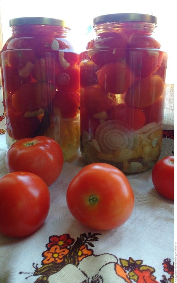 На 3-литрову банку берем: Ø 3 шт. болгарского перца; Ø 4 зубчика чеснока; Ø 4 шт. лука; Ø 1 шт. горького перца (если любите остренькое). Маринад: · 1 л. воды; · 1 стакан масла; · 1 ч. ложка соли; · 3 ст. ложки сахара; · 6 горошин перца; · 6 шт. лаврового листа; · ½ стакана 7%-ого уксуса. В вымытую 3-х литровую банку кладем: пополам порезанные помидоры (если томаты мелкие, можно класть целыми); разрезанный вдоль на 4 части болгарский перец (вместе с семенами); лук, порезанный кольцами; чеснок; небольшой стручок горького перца. В кастрюлю выливаем 1 литр воды. Добавляем стакан растительного масла, соль, сахар, перец горошком, лавровый лист. Даем рассолу вскипеть и заливаем в банку. Накрываем крышкой и даем постоять 10-15 минут. Затем опять сливаем в кастрюлю, добавляем уксус, кипятим и вновь заливаем в банку. Заказываем крышкой, переворачиваем и оставляем до полного остывания. Приятного аппетита!!! Жду ваши лайки, репосты, комменты! ПОДПИСЫВАЙТЕСЬ!!! Вам не трудно, а мне приятно))))