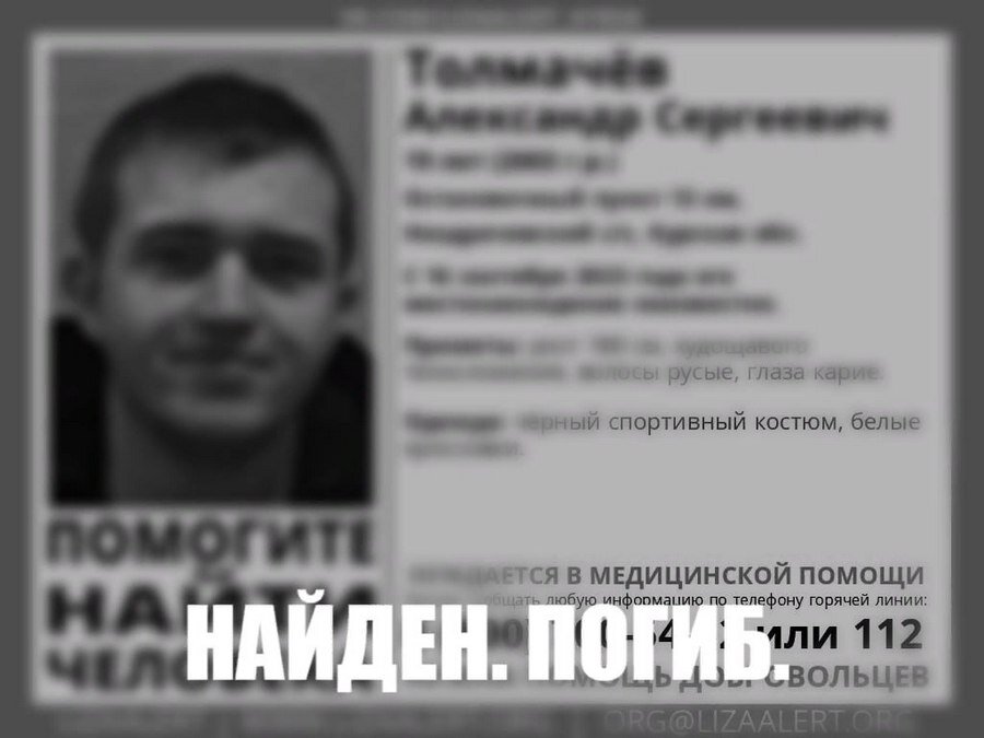 Пропавший три дня назад в Курском районе 19-летний парень сегодня найден погибшим. Информация об этом и соболезнования родным и близким сегодня появилась на форуме поисково-спасательного отряда «Лиза Алерт», который организовывал поиски. Родители молодого человека через соцтети обратились к возможным очевидцам трагедии. Они говорят, что юношу сбил автомобиль на дороге. При этом они уверяют, что тело отнесли на три километра от дороги, чтобы скрыть следы преступления. Родственники просят отозваться свидетелей ДТП и автомобилистов, которые проезжали по трассе на Ноздрачево 16 сентября: возможно, ценная информация есть на записях видеорегистраторов. Звонить просят по телефону 8 (951) 074-99-43. В СК подтвердили гибели молодого человека. Тело было обнаружено сегодня ночью. Следственный комитет начал проверку. Антон ФИЛИППОВ, фото Лиза Алерт Курск Постоянный адрес новости на сайте «Друг для друга» ~ https://dddkursk.ru/lenta/2023/09/19/101266/. Новости Курска за ~ 19 сентября ~ сентябрь 202