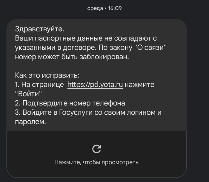 На днях пришла интересная СМС. Странно думаю я, паспорт не менял, переходил на йоту с сохранением номера лет 6 назад. По инструкции заходим на сайт, авторизуемся и... ничего. Данные не совпадают, проверьте правильность. Уже в салоне вытесняется, что мой номер записан на какую-то женщину, данные которой естественно не говорят. Очень странно, с этим номером я в своё время пробежался по большой тройке, номер был точно на мне, иначе кто бы мне дал перейти? Что имеем, кто-то зачем-то переписал мой номер на другое лицо, чтобы доказать, что номер мой, я поехал за выписками из банка, мол смотрите, симка у меня, счёт пополняю я. В Сбербанке тоже весело, теперь через банкомат не распечатать чеки, иди к живому человеку. И вот вопрос, почему номер поменял владельца без моего ведома? Почему я должен тратить время, жечь бензин и т.п., чтобы доказать, что номер мой. А самое интересное, я не один такой. Пост автора CosmoStas. Узнать, что думают пикабушники.