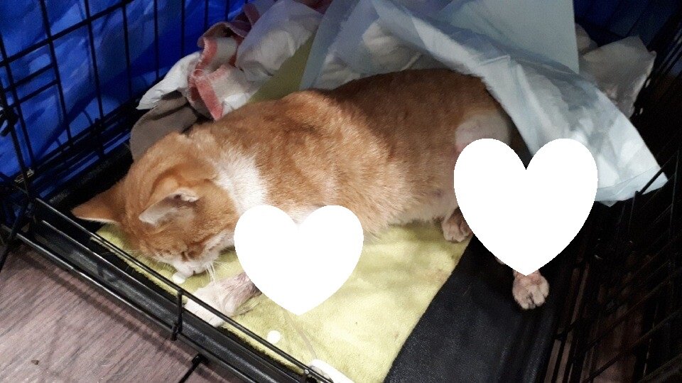 При осмотре никаких следов от укусов/зубов собак обнаружено не было. Зато, оказалось, что сломана еще передняя лапа и хвост. По характерной ссадине на боку, ветеринар сделал вывод, что кота сбила машина. Кот попал на попечение волонтеров. В клинике приюта ему могли предложить только ампутацию лапы, но куратор решила отвезти подопечного в другую клнику города. Там ему провели операцию по "ремонту" двух лап и хвоста. Кроме того, заодно, его кастрировали. Из наркоза мальчишка выходил тяжело. Его оставили в стационаре на несколько дней, по прошествии которых идти ему было некуда. Начали искать передержку или сразу дом. По прошествии пяти дней, питомца выписали из клиники. Его забирала