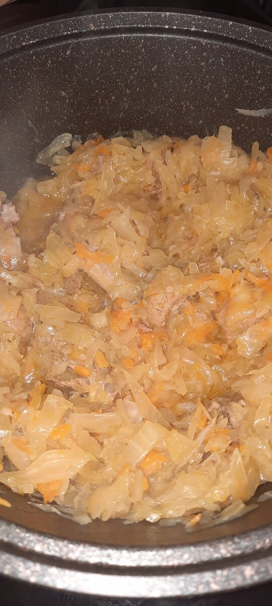 Пришло время капусточки. Моей любименькой! Странно правда, но я почему-то практически перестаю летом тушить капусту. Хотя, очень люблю ее. Моя одна бабушка тушила капусту всегда с картошкой. А другая добавляла при тушении молоко. И так и эдак получалось очень вкусно. Я люблю из 4-х ингредиентов: мясо, капуста, лук и морковь. Ну и соль и масло растительное. Люблю, чтобы тушилась долго и стала мягкая-мягкая, а мясо прям, чтоб отделялось от костей, если они есть. Сначала мясо складываю на дно толстостенной кастрюли (лучше, утятницы), тушу около получаса, а за это время чищу и режу лук и тру морковь и добавляю к мясу. Можно лавровый листик, перец горошком, помидору положить. Я тушила без всего этого. Шинкую капусту и накладываю до самой крышки. Потом она осядет. Через час солю и перемешиваю. И тушу еще примерно полчаса. Около двух часов тушится моя капуста. Для кого-то это много и скажут, что совсем не осталось витаминов, но больше всего витаминов в свежей капусте. А я люблю именно