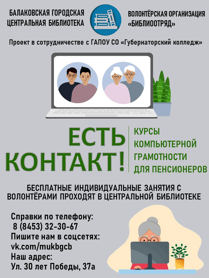 Балаковская городская центральная библиотека приглашает желающих принять участие в проекте «Есть контакт!» – курсы компьютерной грамотности для пенсионеров. Проект реализуется совместно с волонтёрами Губернаторского колледжа. Пройдя обучение, вы сможете: создавать и редактировать тексты, пользоваться электронной почтой, запоминающими устройствами для хранения и передачи данных, оперативно находить всю необходимую информацию в сети Интернет, общаться в социальных сетях, смотреть кинофильмы и телепередачи, слушать музыку, читать электронные версии книг, журналов, газет, а также пользоваться различными электронными сервисами для получения государственных и муниципальных услуг, записи к врачу, оплаты коммунальных услуг, покупки билетов и др. Количество занятий для каждого ученика – 10. Каждое занятие проходит индивидуально, один или два раза в неделю. Занятия бесплатные. Обращаем ваше внимание на то, что данные занятия не являются профессиональным обучением и не предполагают выдачу дипломо