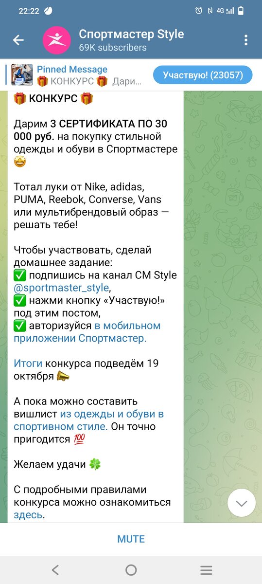 Очередной розыгрыш от крупного бренда! На этот раз у нас есть не нулевая возможность выиграть сертификаты на одежду в Спортмастере и обновить свой внешний вид. Что может быть в этом плохого ? Да ничего! Тем более условия конкурса до безобразия просты. 1. Подписаться на группу Спортмастера 2. Скачать и авторизоваться в приложении Спортмастера 3. Нажать кнопку Участвую и всё! Я отношусь к участию в конкурсах как рыбак к ловле рыбы. Я расставляю сети и удочки в различных водоемах. Никто не гарантирует что сегодня, я уйду с добычей. Но это не означает что надо остановиться, наоборот, нужно закидывать как можно больше удочек и удача мне обязательно улыбнётся!
