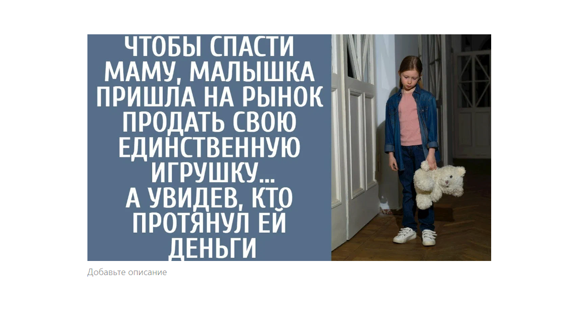 После операции врач сказал ей, что уже поздно.Василисе пришлось остаться без мужа, без его поддержки и с большим кредитом, который нужно было отдавать строго в установленные сроки, иначе она могла остаться без квартиры.Анна погладила куклу с красивыми волосами.Извини меня, принцесса, но если мы не купим маме лекарства, она не сможет работать, и тогда нас выселят из дома.Девочка нежно обняла куклу, а затем аккуратно завернула ее в пакет.