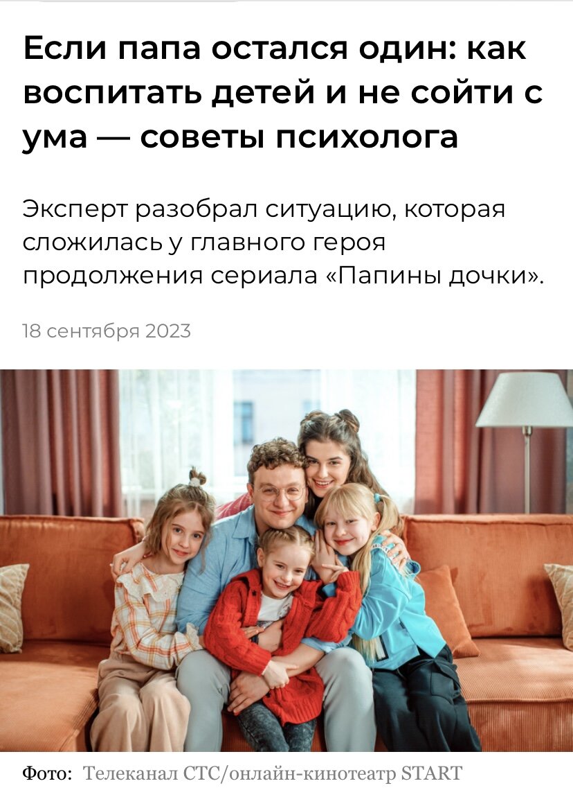 И меня в качестве семейного психолога пригласили поучаствовать в экспертном мнении на канала СТС для недавно вышедшего вновь сериала «Папины дочки».