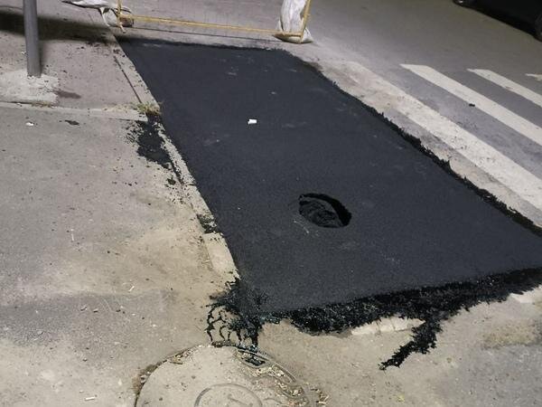 По словам местных жителей, провал появился на улице Обороны, 25. На снимках видно, что асфальтобетонное покрытие еще совсем свежее, его только что уложили дорожники. Дорога еще не успела остыть, как на месте снова образовалась глубокая яма.