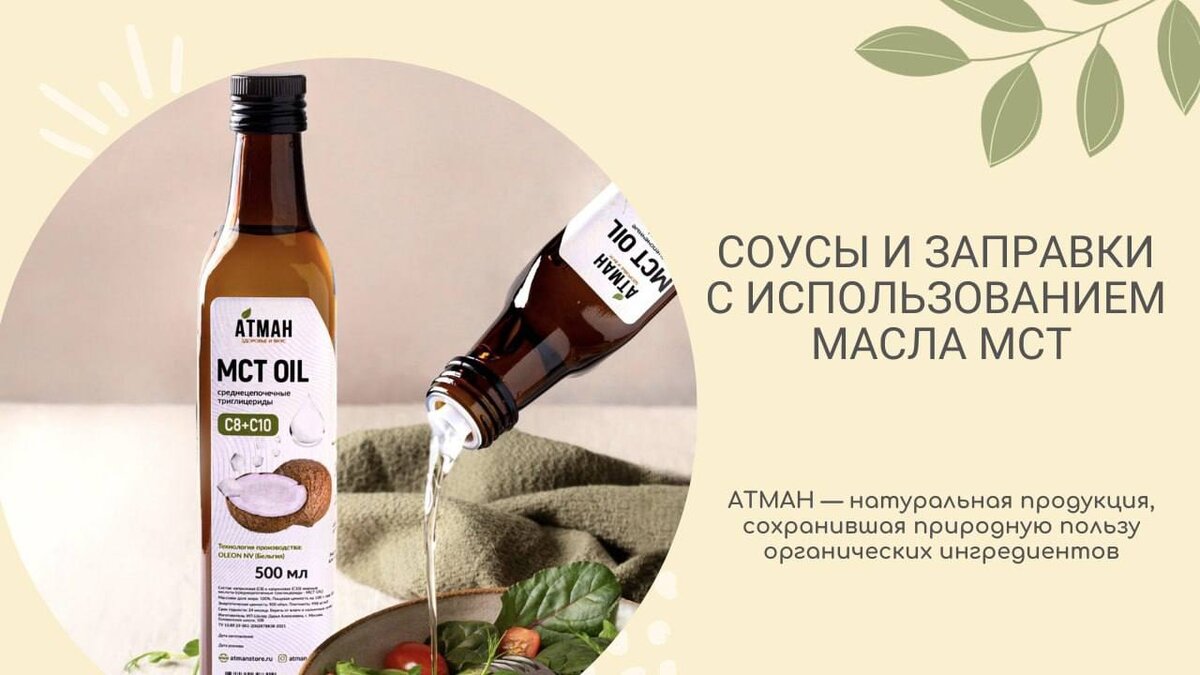 Заправка — это последний штрих, который может превратить даже обычный салат из свежих овощей в нечто особенное, добавив уникальные вкусовые нотки. Возможно, вы знакомы с тем, как сложно найти в магазинах соус с натуральным составом. Производители часто добавляют много Е-добавок, консервантов и усилителей вкуса, а также рафинированный сахар. Все эти компоненты могут превратить даже самый полезный салат в вредное блюдо! Мы, команда АТМАН, особенно ценим возможность создавать и выбирать лучшие продукты для себя и своих близких. У нас всегда много гостей, и мы любим угощать их новыми и необычными вкусами. Приготовление ужина — это наше увлечение, и мы гордимся, когда просят рецепты после того, как друзья или гости попробовали наши блюда. У нас накопилось множество рецептов вкусных и полезных соусов и заправок, основным ингредиентом в которых является масло МСТ. Его нейтральный вкус и аромат дают нам широкие возможности для кулинарных экспериментов. Это масло можно смешивать с пряными спе