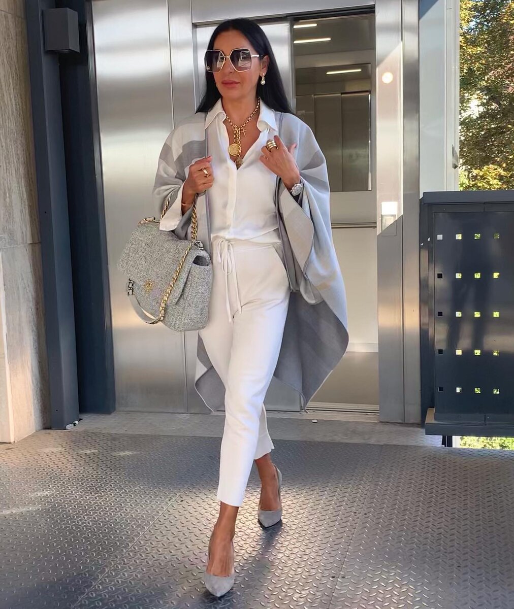 Серый для многих женщин является любимым цветом и это не удивительно. Он покоряет своей практичностью и простотой стилизации. Наши сегодняшние героини доказывают, что серый цвет – это не скучно, а красиво и актуально независимо от трендов и времени года. Серый – это цвет элегантности! Посмотрите на комби белоснежной рубашки, брюк и серой накидки. Вместительная сумка и замшевые «лодочки» ничуть не выбиваются из образа. Серый хорош тем, что с ним любой принт будет выглядеть удачно. Брючный костюм отлично ладит с актуальной клеткой, аксессуарами, голубыми ботильонами. Оживить наряд в серых тонах можно с помощью обуви. Это могут быть ботильоны красного цвета, розовые туфли. Чтобы приблизить фигуру к «песочному силуэту», подчеркните талию поясом. Ахроматический серый гармонирует с розовым цветом. Этот очаровательный дуэт обожают и юные барышни, и женщины постарше. Монохром – всегда отличная идея! Ансамбли в одном цвете выгодно стройнят, добавляют роста. Принтованная обувь и крупная бижутери