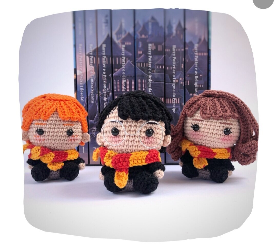 Продолжаем вязать героев Поттерианы. Первым был Гарри: Потом Рон: Полумна: Перевод: Вязальные приключения Условные обозначения: КА - кольцо амигуруми ВП - воздушная петля СБН - столбик без накида ПССН - полустолбик с накидом ССН - столбик с накидом СС- соединительный столбик УБ - убавка ПР - прибавка Материалы: Тело Начинайте вязать темно-серой нитью. 1 ряд: 6 СБН в КА [6] 2 ряд : 6 ПР [12] 3 ряд: (1 сбн, 1 пр) х 6 [18] 4 ряд: 1 сбн, 1 пр, (2 сбн, 1 пр) х 5, 1 сбн [24] 5 ряд: 24 СБН [1 ряд] Изменить цвет на черный 6-9 ряды: 24 сбн [4 ряда] 10 ряд: 1 сбн, 1 уб, (2 сбн, 1 уб) х 5, 1 сбн [18] 11: 18 сбн [1 ряд] Голова Сменить нить на бежевую 12 ряд: 1 сбн, 1 пр, (2 сбн, 1 пр) х 5, 1 сбн [24] 13 ряд: (3 сбн, 1 пр) х 6 [30] 14 ряд: 2 сбн, 1 пр, (4 сбн, 1 пр) х 5, 2 сбн [36] 15 ряд: (5 сбн, 1 пр) х 6 [42] 16-23 ряды: 42 сбн [8 рядов] 24 ряд: (5 сбн, 1 уб) х 6 [36] 25 ряд: 36 сбн [1 ряд] 26 ряд: 2 сбн, 1 уб (4 сбн, 1 уб) х5, 2 сбн [30] 27 ряд: (3 сбн, 1 уб) х 6 [24] •Вставить глаза в 8-м ряд