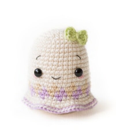 Хоть один перевод привидения да будет этой осенью. Прошлой осенью их было достаточно много. Перевод: Вязальные приключения Условные обозначения: КА - кольцо амигуруми ВП - воздушная петля СБН - столбик без накида ССН - столбик с накидом ПССН - полустолбик с накидом СС- соединительный столбик УБ - убавка ПР - прибавка Материалы: Тело Начать вязать кремовой пряжей. 1 ряд: 6 сбн в КА (6) 2 ряд: 6 ПР (12) 3 ряд: (1 сбн, ПР)* повторить 6 раз (18) 4 ряд: 1 сбн, ПР, (2 сбн, ПР)* повторить 5 раз,1 сбн (24) 5 ряд: (3сбн, ПР)* повторить 6 раз (30) 6 ряд: 2сбн, ПР, (4 сбн, ПР)* повторить 5 раз, 2 сбн (36) 7-8 ряды: 36 сбн (36) 9 ряд: (11 сбн, ПР)* повторить 3 раза (39) 10-11 ряды: 39 сбн (39) 12 ряд: 6 сбн, ПР, (12 сбн, ПР)* повторить 2 раза, 6 сбн (42) Вставьте глаза между 13 и 14 рядами. Расстояние между глазами должно быть 9 петель. 13–14 ряды: 42 сбн (42) 15 ряд: 10 сбн, ПР, 20 сбн, ПР, 10 сбн (44) Теперь вяжем жаккардом. 16 ряд: кремовой пряжей 1 сбн, (песочной пряжей 1 сбн, кремовой пр