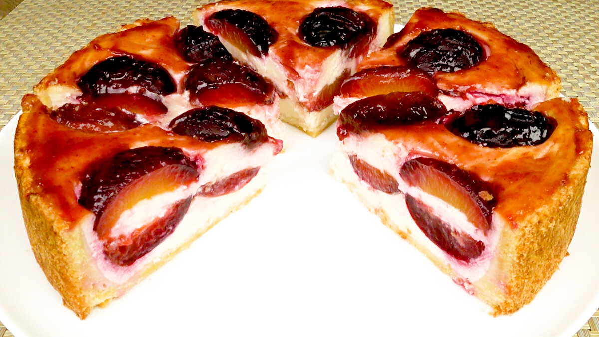 Этот десерт - великолепный подарок к семейному чаепитию. В нем прекрасно сочетается песочное тесто, творожная и сливовая начинки. Каждый кусочек - истинное наслаждение. Приготовление: В просеянную муку добавляю мягкое сливочное масло и перетираю. В крошку добавляю сахар, ванильный сахар, соль, яичный желток и замешиваю тесто. Дно формы, диаметром 24 см, выстилаю пергаментом и смазываю сливочным (растительным) маслом. Выкладываю тесто и распределяю по дну и бокам формы, формирую бортики, высотой 5 см. Форму с тестом отправляю в холодильник на 30 минут. Готовлю начинку. В творог добавляю размягченное сливочное масло, сахар, яйцо и оставшийся яичный белок, ванильный сахар, соль, кукурузный крахмал. Всё пробиваю блендером. Достаю форму с тестом из холодильника, дно накалываю вилкой. Выкладываю половину творожной начинки и разравниваю. Сливы разрезаю пополам, вынимаю косточки и выкладываю на творог срезом вверх. Поверх слив выкладываю оставшуюся творожную начинку и разравниваю. Выклады