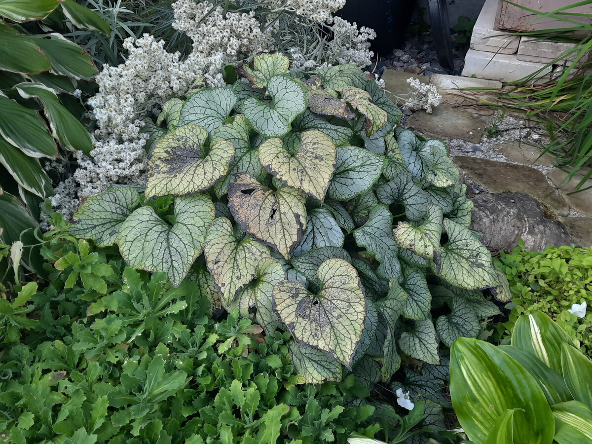 Это бруннера Вариегата. Очень интересный и не простой сорт. Все ей не так и не эдак. И солнце не по ней, и в тени не все нравится. Зато очень красивый. Несколько листьев пришлось оборвать, когда сильно подсохли по краям.