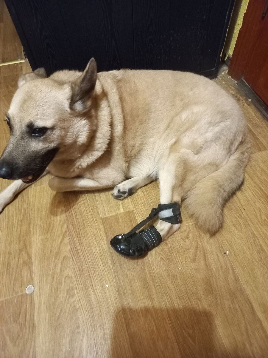 специальные ортопедические ботинки с фиксатором скакательного сустава, чтобы облегчить ему жизнь, чтоб мальчик не стирал лапы. Два года Филя в них отлично отходил и вот пришло время заказать новые.
