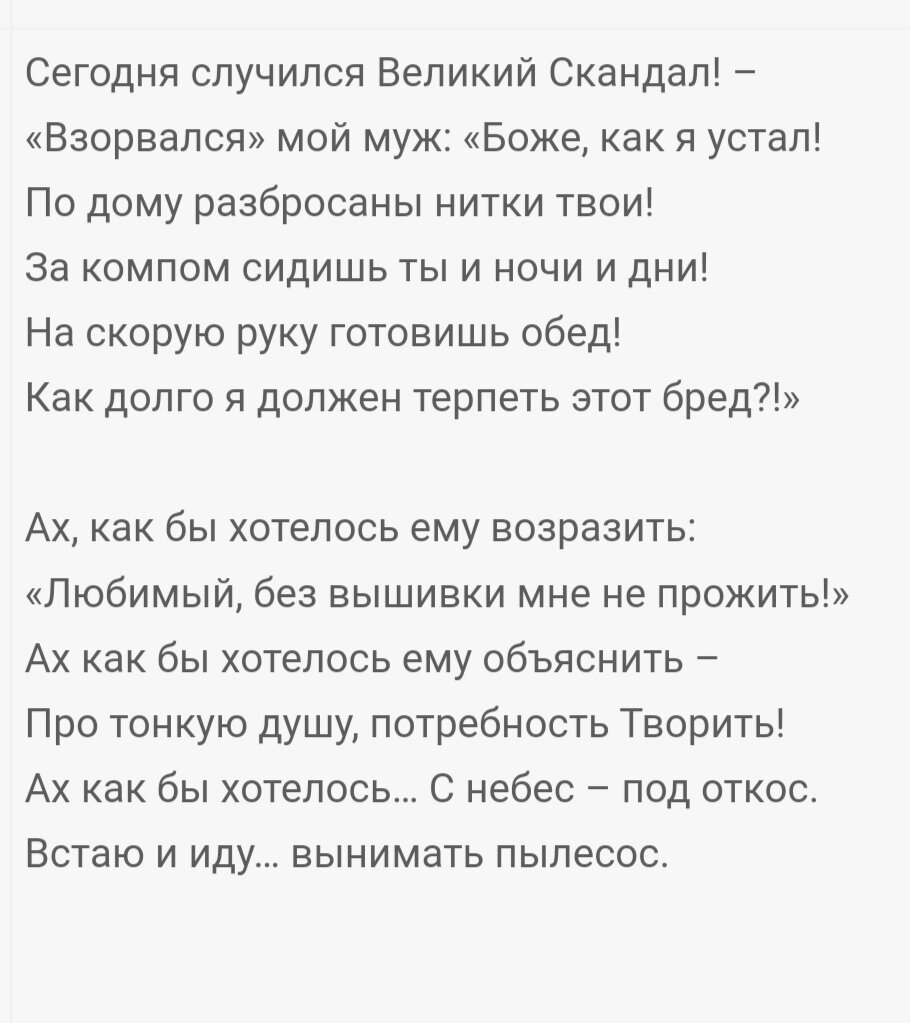Нахомячила полную норку: Нитки, вышивки в каждом углу, А наборов приличную горку , Я пристрою пока на полу... Муж ворчит, что так больше не может, Обходя мой станок по кривой, Но меня это мало тревожит - Я в работу ушла с головой. Отрастить бы ещё рук две пары, Да в три раза бы день растянуть, Я б дошила кусочек гитары, И вон тех незабудок чуть-чуть, Да закончила б старую кошку, Начала бы осенний букет... А вот так, каждый день понемножку, Это ж мучиться - сил больше нет!!! Ведь так хочется вышить всё сразу, А потом ещё больше набрать!!! Это - мания, это - зараза! Вышивать! Вышивать! Вышивать!!! Что за схемки! Какие красоты! Загребу, сколько хватит руки! До свиданья! Удачной охоты, дорогие мои хомяки!!!! ( стихотворения с просторов интернета) . А у меня потихонечку приближается к финишу моя ,, Дубовая роща" от ЛукаС. На сегодняшний день готовность работы 96,99 %. Осталось до финиша 4852 стежка.💃💃💃 До скорых встреч!!! Ваша Наталья😘