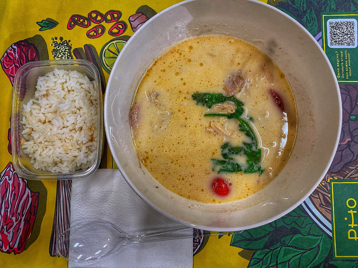 Экзотическая тайская кухня — не только очень вкусная, но и весьма полезная. Разнообразные специи, которыми традиционно приправляются тайские блюда, укрепляют иммунитет, повышают тонус и благотворно влияют на организм в целом. Главными ингредиентами супа Том Кха являются кокосовое молоко, имбирь, лайм, рис, морепродукты или курица. Рис, как правило, подают отдельно вместо хлеба, а сам суп Том Кха рекомендуется приправить соком лайма. Калории: Белки: Жиры: Углеводы: Пищевая ценность на 100 г. Калорийность рассчитана для сырых продуктов. ПРОДУКТЫ ДЛЯ РЕЦЕПТА Рассчитано на 6 порций! Для супа Куриное филе 300г Вода 400 мл = 400г Кокосовое молоко 250 мл = 250г Лемонграсс 40 г Сок лайма 4 ст. л. = 40 г Листья каффир-лайма 4 шт. = 4 г Перец Чили 2 шт. = 30 г Помидоры черри 5 шт. = 100 г Рыбный соус 1 ст. л. = 18 г Корень галангала 4 долька = 20г Шампиньоны 300 г Для риса и подачи Рис «жасмин» 250 г вода 300 мл = 300 г соль 1 ч. л. = 10 г гвоздика 10 шт. = 10 г лимон 50 г оливковое масло 1 ч