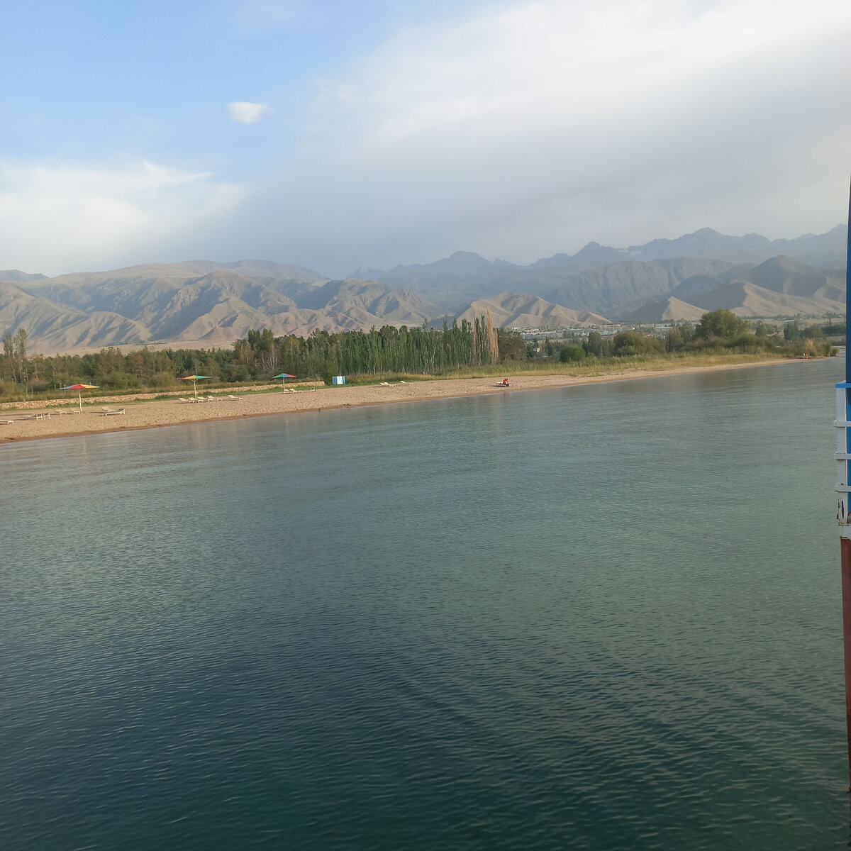 В конце августа мы с сестрой и её маленькими внуками съездили на неделю на Иссык-Куль. Из Алматы ехать одну ночь на автобусе. До границы один автобус, пешком пересечь границу, потом пересадка на кыргызский автобус. Отдыхали мы в пансионате «Ак Бермет». Специально выбрали «старый» пансионат, с большой территорией. Есть где прогуляться. Деревья, конечно, посажены очень давно. Мы поселились в новом корпусе. Здесь и Wi-Fiустойчивый, и тепло, в отличие от старых коттеджей. Есть и домики подороже. Немного в сторонке. Мы любим Иссык-Куль. Ездили сюда несколько раз. Впервые почти 60 лет назад. Жили в палатках, купались, а наш папа ловил чебачков с надувной лодки. Теперь о купании. Вода в Иссык-Куле холодная. Прогревается в июле. В июне ещё не теплая, в августе уже не тёплая. На любителя. Нам нравится. Пляж песчаный. Очень приятный мелкий песок. Если не любите холодную воду, можно провести время на горячих источниках. 7 бассейнов, в каждом своя температура. От горячей до очень холодной. Правда,