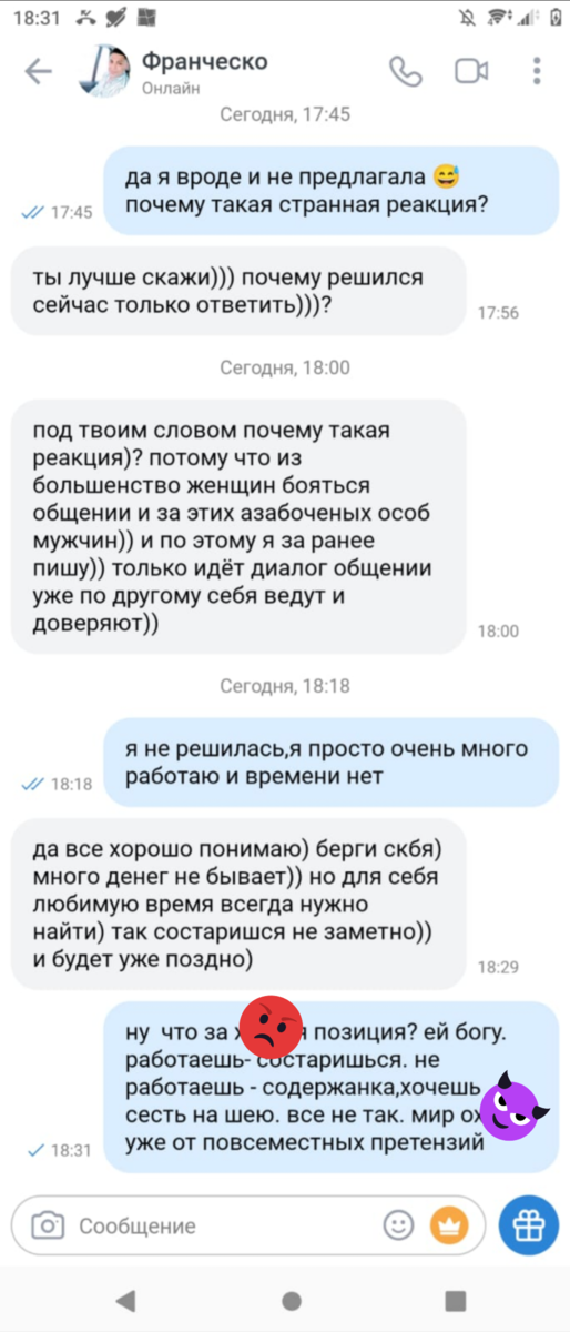 Приветствую всех в твоём фейском гнезде, очередную порцию интересных размышлений принесла. Вообще, мне было бы дико интересно посмотреть на подобные ситуации глазами мужчин. Если вы мужчина и у вас есть такие какие-то подобные истории прямо со скринами, а не просто выдумки- дайте знать. Потому что сейчас мне кажется,будто мир вообще неадекватный и сошёл с ума именно в мужской части. Эскортницу хотя бы видно , вот мужик поначалу обязательно прикидывается нормальным… Одна моя знакомая, которая действительно очень много работает и не имеет возможности вживую заводить знакомства, решила отправиться на один из сайтов, что заменили другой самый популярный сайт по знакомствам. Оказывается, их вообще стало очень много! Я тут даже серёжки покупала в санлайте- так у них прямо в приложении с колечками и кулончиками тоже сервис знакомств! В общем, знакомая отправилась в плавание как она ожидала в море любви, но море оказалось коричневым и полным кое-каких коротких продолговатых предметов. Прис